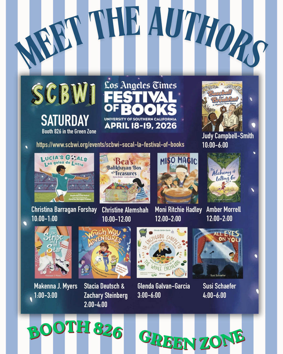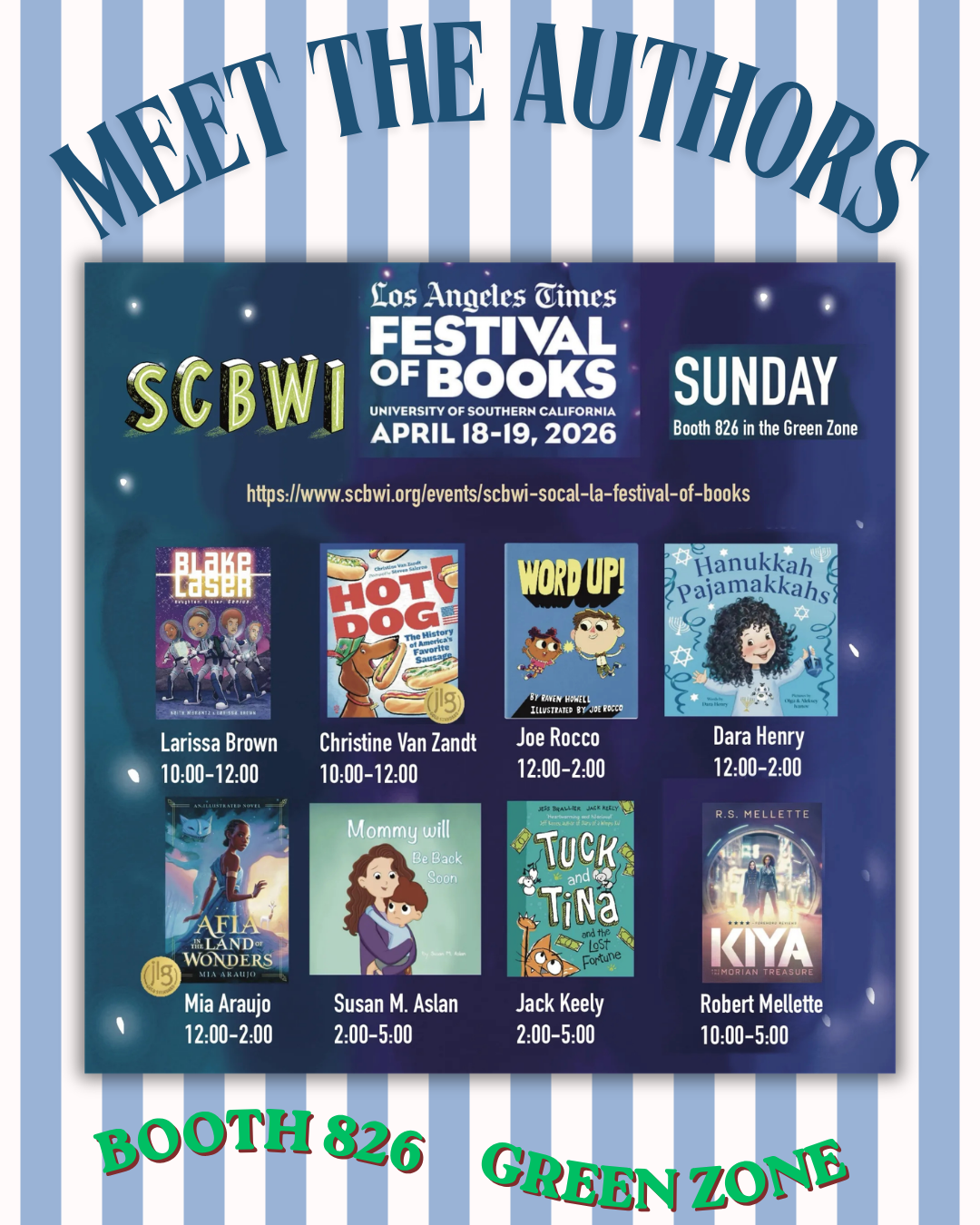If you’re attending the Los Angeles Festival of Books at USC (April 18–19, 2026), be sure to stop by Booth 826 in the Green Zone, where a rotating group of SCBWI SoCal creators will be signing books and meeting readers throughout the weekend.