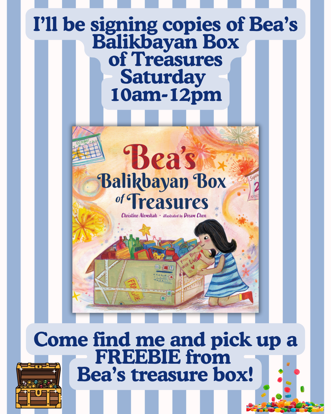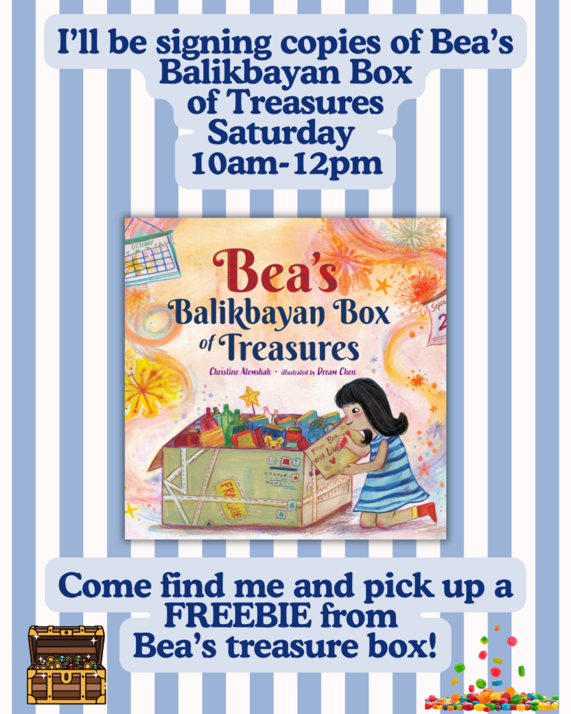 I’ll be signing and selling award-winning picture book, Bea’s Balikbayan Box of Treasures at Booth 826 from 10:00 AM–12:00 PM on Saturday as part of the SCBWI SoCal lineup.